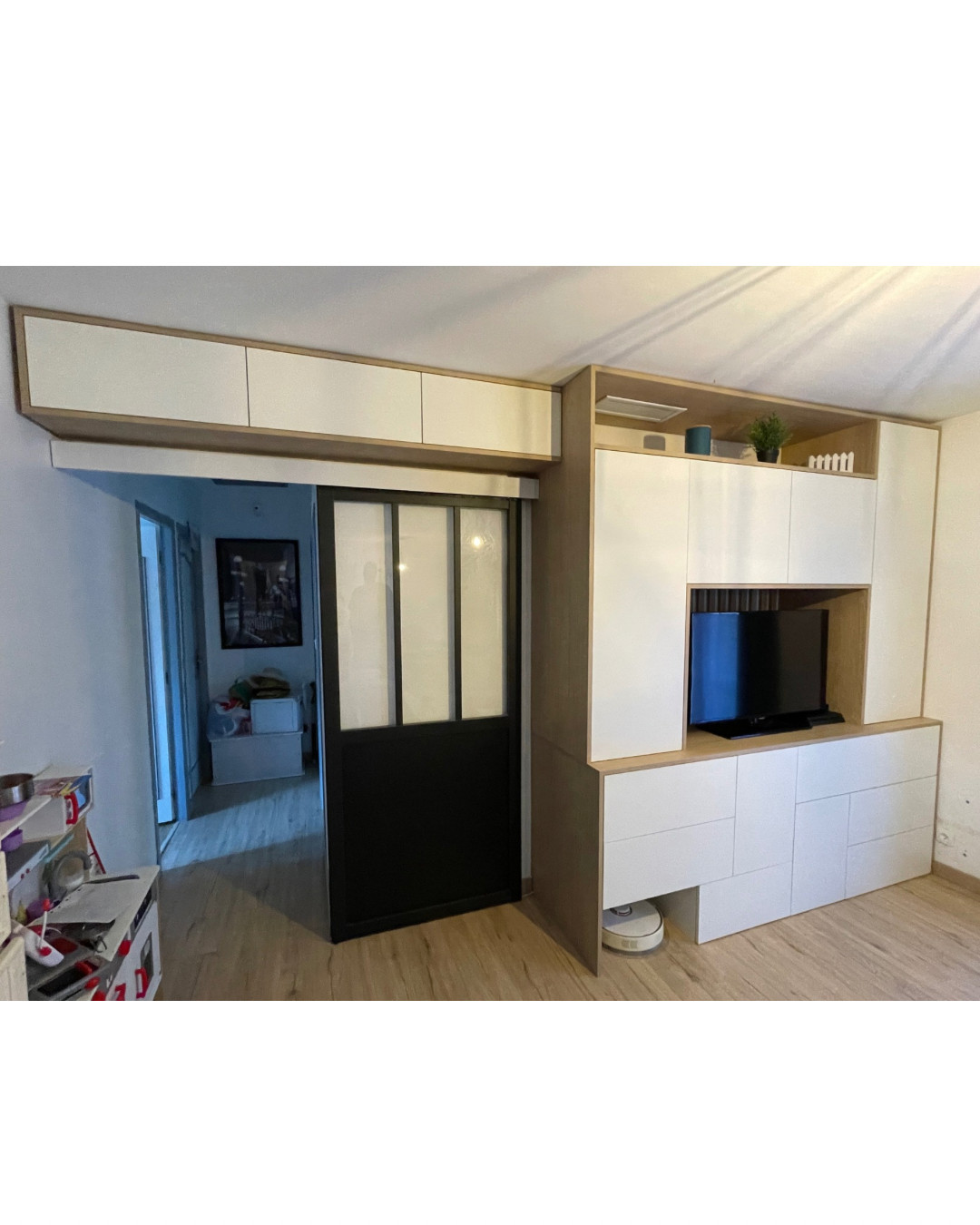 Pour ce projet, nous avons conçu un grand meuble intégré qui structure le mur du séjour et valorise l’espace :
