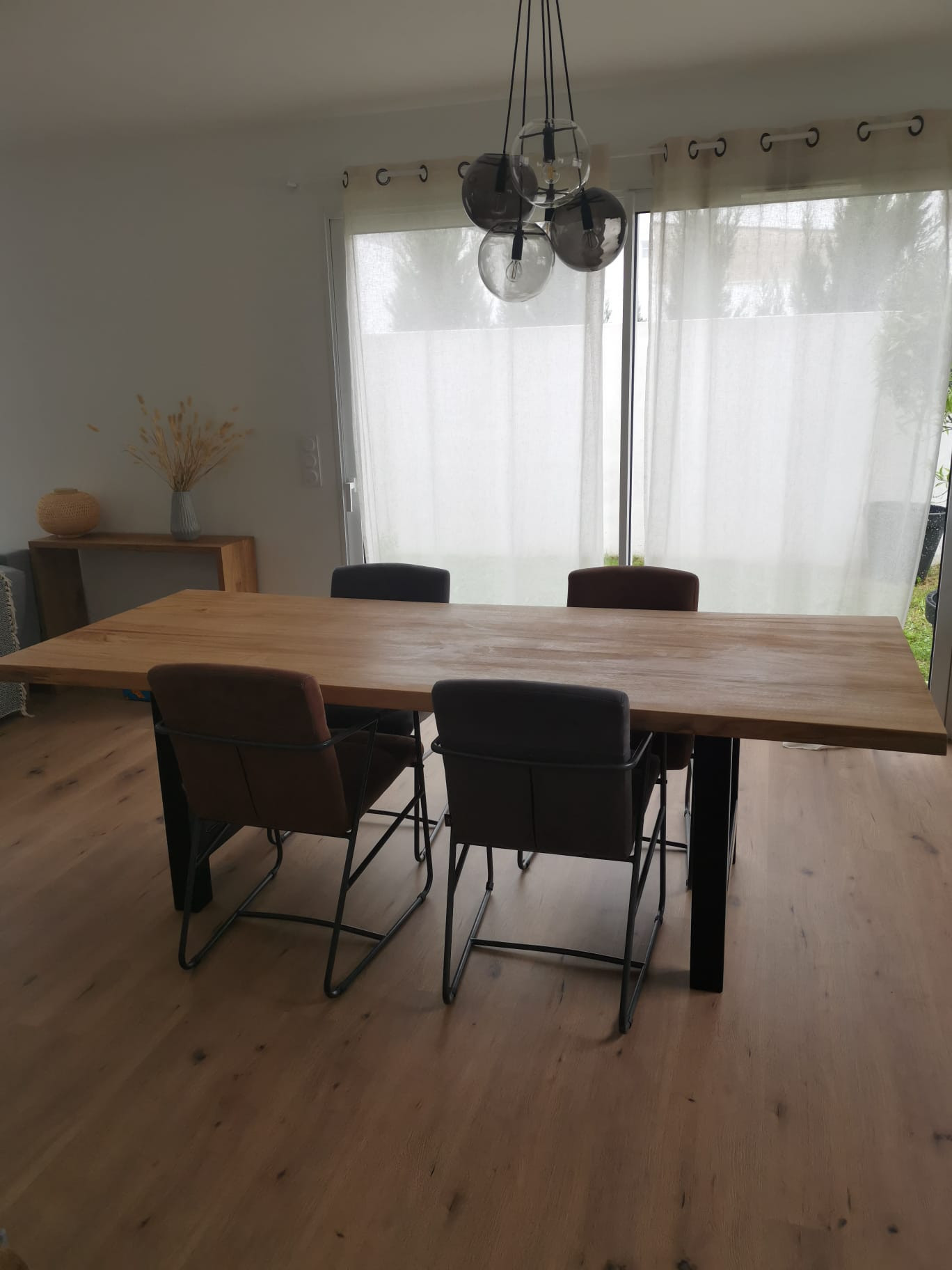 La table a été entièrement personnalisée selon les goûts du client. Nous avons intégré des finitions qui mettent en valeur le grain naturel du bois, offrant ainsi une touche de modernité et d'élégance à l'ensemble. Le défi principal était de créer une pièce de mobilier à la fois robuste et esthétique, capable de s'intégrer harmonieusement dans l'espace de vie.